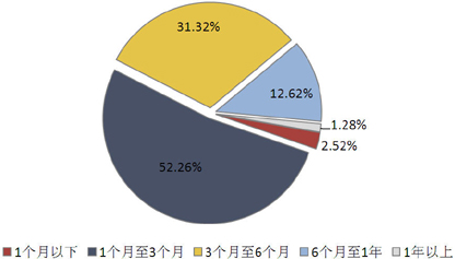 从投资期限来看,1个月以下产品发行了140款,环比减少49款,市场占比下降0.50个百分点至2.52%;1-3个月产品发行了2902款,环比减少315款,市场占比上升0.83个百分点至52.26%;3-6个月产品发行了1739款,环比减少192款,市场占比上升0.45个百分点至31.32%;6-12个月产品发行了701款,环比减少78款,市场占比上升0.17个百分点至12.62%;1年以上产品发行了71款,环比减少68款,市场占比下降0.94个百分点至1.28%。(图3)