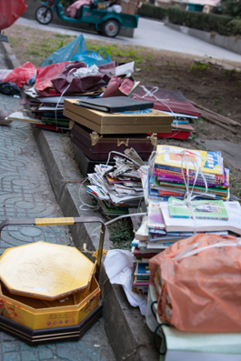 聊起收废品,她跟我介绍,选择这份工作还是选了又选。当年到泰州,做过小工,可没有休息时间;贩过水果,但城管风险太大,而且整天在外,孩子没人带。后来,看到人家收废品,一杆称,一辆三轮车,走走街坊,就有钱挣,关键可以有时间照顾孩子上学,也就做了起来。一开始,也挣不到什么钱,行行都有生意经。这收废品,最麻烦的是分捡整理,卖家把一堆东西指给你,搬运、分捡、打包、称重、装车,全靠你一个人。挣几个钱,也正是分捡的成果。比如,一般的硬质塑料不值钱,要软的。旧报纸和旧杂志的钱也不一样。最好收的是单位的包装箱、盒子,每次都能收不少,好的时候一天能收300多斤,在现场分捡打包好,直接就可以送到“打包站”。说到这儿,她还向我透露点小秘密:废报纸、包装箱等不要送到大收废品站,他们价格低,而一些品种单一的“打包站”会厚道些,总会每斤多给3分5分的。“打包站”呢,会在她们送来的废品上洒些水后,再用机器压缩成块后卖给造纸厂,多赚些重量钱。如今这一行做时间长了,挣钱的路子就开阔许多,不仅有固定家庭客户,还有企业单位,都是手机预约,更少了些风里来雨里去的。