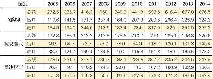 表3 波罗的海三国2005-2014年对外贸易情况 单位:亿美元