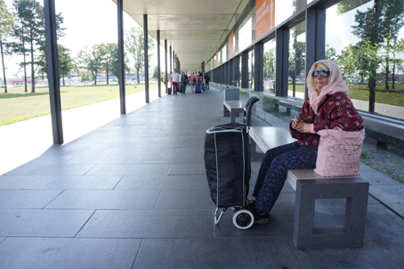 柏林机场不远处就是火车站,因没有零钱在售票机上买票,又没有人工售票,翻译只得返回航站楼换零钱。红眼儿飞行的疲惫,让我很羡慕这位老兄,拍完这张照片,我就躺在了他的不远处。我俩可能都来自文明程度不如德国的远方,他能先在这儿睡上一觉,我却要按规程行走,就此,是不是他内心的自由度要比我好一些呢?自由,自然离不了环境的给予,但心灵的自由,是可以超越环境的。超越的程度,在于我。望着在北京不多见的蓝天,我想我的旅行箱虽然比他的新一点,但心灵的破旧很可能比他严重。人老了,才容易不在乎外物而更多地观照内心,才懂得内心的舒适、喜乐原本是可以超时空的。十几天后回国时,我还会经历红眼儿飞行的折磨,不知道那时的我能不能在首都机场前的草坪上也先睡上一觉。走廊里的游客不断,但快乐的表情不多。痛苦与快乐,这是人类思考了几千年的问题,但现实生活的快乐度却没有多大的改变,我同样没有“快乐德国游”的期望,能够谋得一些新鲜的体验就够了。
