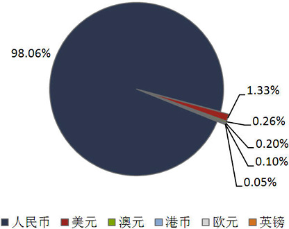 从投资币种来看,人民币产品发行5765款,环比增加320款,市场占比保持不变,仍为98.06%;美元产品发行78款,环比增加7款,市场占比上升0.05个百分点至1.33%;澳元产品发行15款,环比保持不变,市场占比下降0.01个百分点至0.26%;港币产品发行12款,环比保持不变,市场占比下降0.02个百分点至0.20%;欧元产品发行6款,环比减少1款,市场占比下降0.02个百分点至0.10%;英镑产品发行3款,与上月持平,市场占比与上月持平,仍为0.05%。(图2)