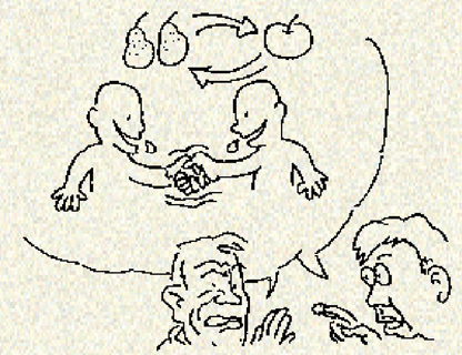 王二所在的王村种苹果,隔壁的李村种梨。每年果子成熟的季节,两村的村民都到集市上互相交换。因为产量相当,一斤苹果换一斤梨,年年如此。