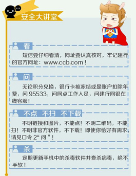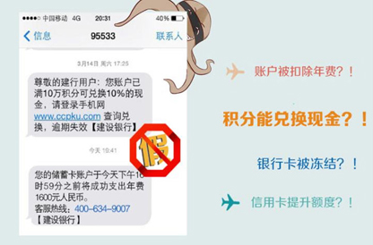 警惕包含网址链接、回拨电话的短信、悬浮窗口或电子邮件等,切勿随意点击不明网址、谨防钓鱼网站,办理业务要拨打官方服务热线,手机动态验证码切勿泄露。建议安装手机安全软件以识别钓鱼网站。不要泄露自己的信用卡信息和个人资料。不要在网吧等公用上网场所进行涉及个人信息的操作。并与银行保持及时联系,一旦发现卡片被盗刷,请立即致电发卡银行冻结卡片,配合银行调查,避免扩大风险损失。(史永婷)