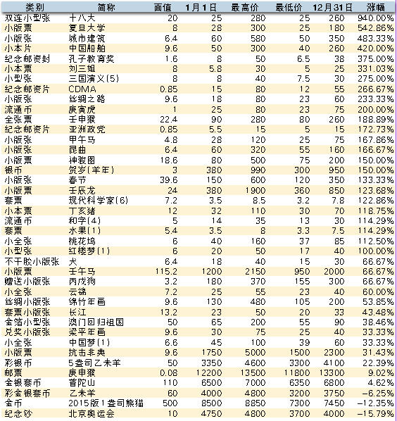 首先看一下2015年整体走强最为突出的板块——邮资封片