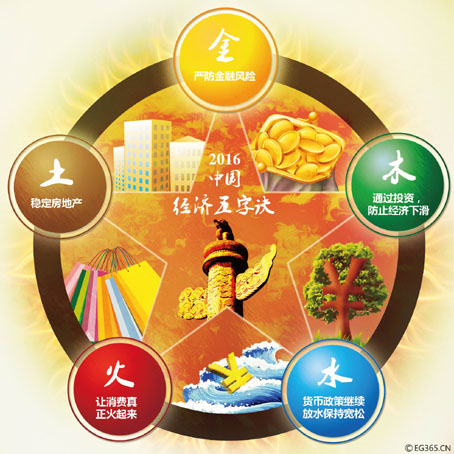 有专家形象的将2016年经济工作总结成五个字:“金木水火土”。金,就是要严防金融风险,2016年,以企业债为代表的各种风险仍然在考验羸弱的中国金融的安全堤坝,企业债违约,银行不良贷款飙升会成为常态;木,就是仍然会通过投资,通过“十三五”的一些大项目的带动,防止经济的下滑;水,就是货币政策继续放水保持宽松,财政政策在加大赤字的同时,下决心减税,为企业减负;火,就是让消费真正火起来,中国经济的未来在消费,消费的扩张和升级需要系统政策,让国内的消费火起来,能挽救很多行业;土,当然就是要稳定房地产,2016年的房地产政策注定是2008年金融危机以来最宽松的一年,会出台包括房贷利息抵个税、农民购房补贴、首付回到20%,2016年经济稳不稳,其实最终仍然取决于房地产。