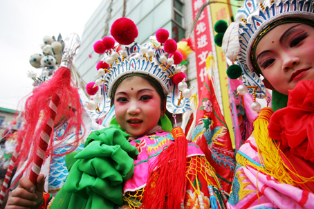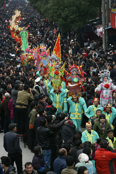 德穿山造趺是宁波一带庙会上深受欢迎的民间艺术项目,五对装扮一新衣着鲜艳的金童玉女高高在上,威风凛凛图/CFP