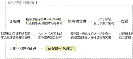 此类诈骗手法是不法分子通过拖库与撞库、公共WiFi、ATM机针孔摄像头、电脑木马等途径获取用户银行卡账户和密码后登录网上银行,通过购买理财产品、定活互转等造成活期账户资金余额减少假象,用户发现账户余额确实减少会轻易信任不法分子,不法分子便会以帮助用户退回资金为由,要求用户告知其之后接收到的短信验证码,不法分子通过获取的短信验证码盗取资金。