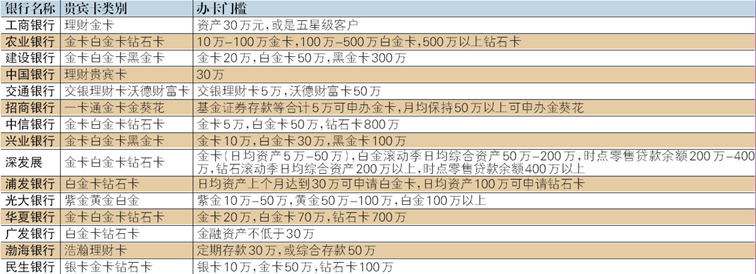 贵宾服务目前是各家银行争夺高端客户市场的重要手段,贵宾卡在很多银行则是要分几个等级。在以下15家银行中,只有工行、中行、广发行和渤海银行没有设置等级,其贵宾卡分别叫理财金卡、理财贵宾卡、白金卡和浩瀚理财卡。其余11家银行在贵宾客户群中又细分了几个等级,大致可以划分为金卡、白金卡、钻石卡级别。