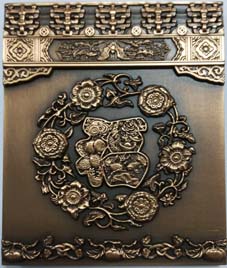 设计上大胆创新。福临门大铜章的创新之处是寓玩于乐,章上的门环可叩击发声,增添乐铜章的趣味性。而五福临门大铜章将我国古代宅院大门实景与这枚长方形铜章的整体设计融为一体,是大铜章艺术设计上的又一次大胆创新!又将中国传统民俗中的门神与传统砖雕图案中的吉祥图案融入,寓意门神纳福,富贵吉祥。