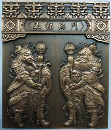 这枚造型独特的大铜章正面图案:整体采用我国古代宅院大门实景设计,图案中有中国传统建筑的门檐造型,门牌上书写“五福临门”四个大字,门板上为中国传统年画中的一对门神。