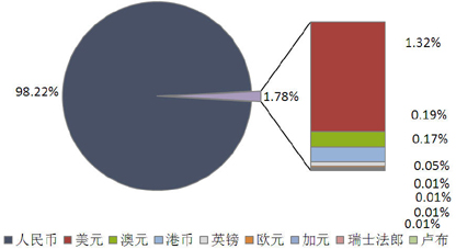 从投资币种来看,人民币产品发行了7374款,环比增加2191款,市场占比上升0.02个百分点至98.22%;美元产品发行了99款,环比增加24款,市场占比下降0.10个百分点至1.32%;澳元产品发行了14款,环比增加3款,市场占比下降0.02个百分点至0.19%;港币产品发行了13款,环比增加5款,市场占比上升0.02个百分点至0.17%;英镑产品发行了4款,环比增加3款,市场占比上升0.03个百分点至0.05%;本月较上月新增了欧元、加元、瑞士法郎、卢布产品,均发行了1款,市场占比均为0.01%。(图2)