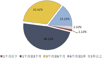从投资期限来看,1个月以下产品发行了84款,环比减少25款,市场占比下降0.95个百分点至1.12%;1-3个月产品发行了3612款,环比增加945款,市场占比下降2.42个百分点至48.11%;3-6个月产品发行了2509款,环比增加824款,市场占比上升1.49个百分点至33.42%;6-12个月产品发行了1145款,环比增加441款,市场占比上升1.91个百分点至15.25%;1年以上产品发行了158款,环比增加45款,市场占比下降0.04个百分点至2.10%。(图3)