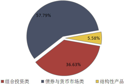 从投向类型来看,债券与货币市场类产品发行了4339款,环比增加1163款,市场占比下降2.38个百分点至57.79%;组合投资类产品发行了2750款,环比增加911款,市场占比上升1.78个百分点至36.63%;结构性产品发行了419款,环比增加156款,市场占比上升0.60个百分点至5.58%;融资类产品仍然没有发行。(图4)