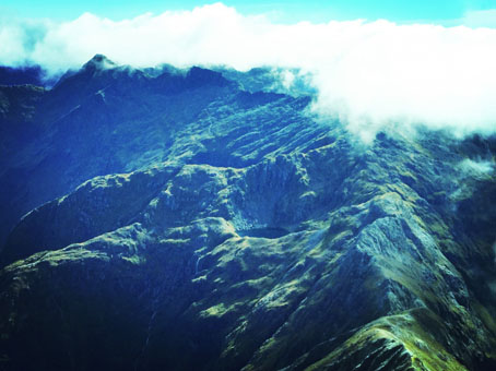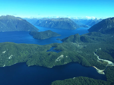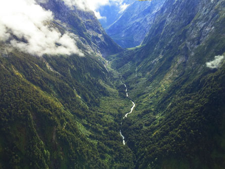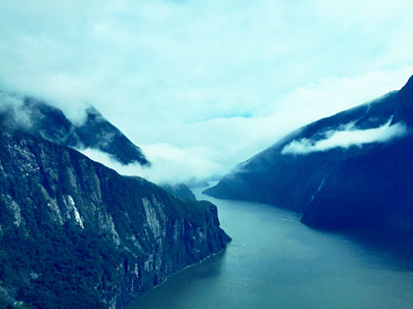 由于风大,大多数飞机在那几天都是停飞的,但如果到了新西兰不领略一次峡湾的风采也确实遗憾,几经周折,我们决定直奔Te Anue机场,一个很小的商用机场,把飞行员“堵”在了门口,幸好有美女飞行员Katie勇于接下了我们这单才让我们有机会感受这壮阔的米尔福德峡湾。当直升飞机一点点离开地面,眼前出现了峡谷,我们穿越在重山峻岭之间,俯瞰新西兰的第二大湖Te Anue,云飘在身边、天空仿佛没有尽头。