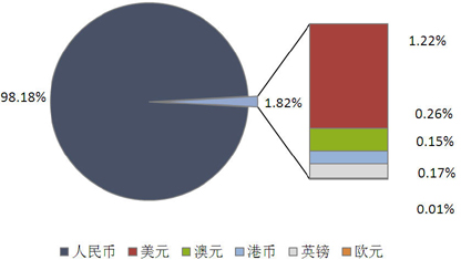 从投资币种来看,人民币产品发行了7136款,环比减少238款,市场占比下降0.03个百分点至98.18%;美元产品发行了89款,环比减少10款,市场占比下降0.09个百分点至1.22%;澳元产品发行了19款,环比增加5款,市场占比上升0.07个百分点至0.26%;港币产品发行了11款,环比减少2款,市场占比下降0.02个百分点至0.15%;英镑产品发行了12款,环比增加8款,市场占比上升0.11个百分点至0.17%;欧元产品发行了1款,环比保持不变,市场占比未发生变化,仍为0.01%。(图2)