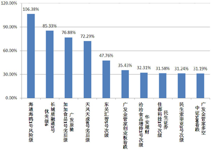 从表现最好的产品收益情况看,月度收益率前十的产品中,有8只成立不到一年,绝大多数产品带有杠杆。(图10)