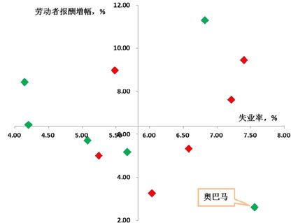 观察71年间美国的微观福利情况,例如,失业率均值为5.8%,劳动者报酬平均增幅为6.4%,其中,执政期间劳动者报酬增幅高于历史均值的,有6位总统,两党各占一半;执政期间失业率低于历史均值的,也有6位总统,但民主党占了4位。
