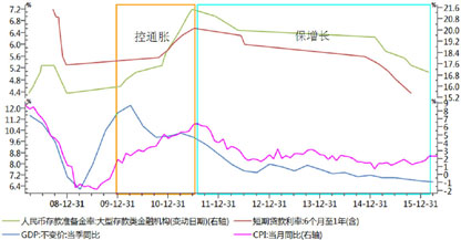 实际上,从2010年开始,央行货币政策的基调表述就从“适度宽松”转向“稳健的”货币政策,但在每个阶段,往往会根据经济的内外环境、政府的主要目标是侧重于保增长还是侧重于控通胀而有所偏向。同样是“稳健的货币政策”,在2010年1月-2011年7月期间,由于通胀上行较快,就采取提准加息的紧缩性操作;2011年下半年后由于经济增速出现明显放缓,为保增长转而多次使用降准减息的扩张性政策。这里体现了“稳健”的内涵——根据经济环境和政策目标而左右调整,很有相机抉择、便宜行事、随机应变的意味。(图4)