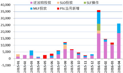 近两年在公开市场逆回购工具使用频率大幅提高。对阶段性的资金紧张,央行频繁通过逆回购、SLO、SLF和MLF等方式及时进行流动性对冲。尤其是从2015年开始,公开市场操作清一色的逆回购。根据Wind数据,从2015年1月至2016年4月期间,央行投放逆回购共计91780亿元,投放SLO共计7250亿元,投放SLF累计约5419亿元,投放MLF累计29713亿元,提供PSL累计10081亿元。频繁的使用中短期流动性工具,到期时如果市场资金紧张则滚动续作,相当于把中短期流动性扩展到长期。这种滚动释放中短期流动性的做法在近两年较为典型,体现了审慎微调的思路,同时也不推升市场的人民币贬值预期。对市场的直接影响是平抑资金利率的短期波动,使市场资金面维持在一个紧平衡的状态。(图5)