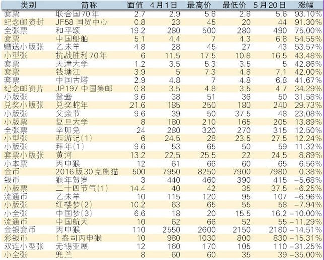 在大量套票纷纷走强的背景下,2016年发行的新邮也成了市场投资者青睐的香馍馍,5月中旬“丙申猴”套票、全张票、小版张、赠送小版张和小本票价格分别为18元、730元、140元、48.5元和64元,“拜年(2)”套票和小版张分别在3.5元和38元整固,而“刘海粟作品选”全张票、套票和小版张则分别在170元、6.2元和50元盘旋,“中国邮政开办120年”套票和小全张分别盘旋在4.3元和39元,“二十四节气(2)”套票和小版票分别在10.8元和25元成交,而“高逸图”全张票、套票和小型张分别在93元、8.5元和18.8元交易,“中国古镇(2)”套票和小版张分别为6.8元和40元,“全民阅读”套票和小版张分别在3.5元和40元成交。而“宋慈”、“唐山园博会”、“交通大学”和“现代科学家(7)”套票分别上扬至4元、3.6元、4.1元和4.8元。