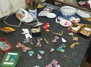 在宋天亨的家里,工作台上堆放着刻刀、钳子、剪子、竹篾、绢、颜料、画笔等工具,墙上挂着他自己做的风筝,有“五福拜寿”、“蝴蝶”、“寿带鸟”和“老鹰”风筝,精细的做工透出浓郁的乡土气息。