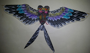 刚开始宋天亨制作的风筝是用纸糊的,因为纸质的容易烂,后来他就用纱绢替代了白纸,然后就在纱绢上画图案。“我以前学过写意画,结果全使到风筝上了,有人说我的风筝好看,说我卖的不是风筝是画。我画风筝从来不去模仿别人,我经常看《动物世界》,也善于观察动物,比如老鹰、仙鹤的翅膀,在飞翔时是呈波浪式运动的。一旦领悟了,什么样的风筝都能做出来,无论形状、颜色,这都不是问题。我扎的老鹰风筝栩栩如生,鹰的脖子上粘上白色的鸡毛,肚子上粘上黑色的鸡毛,鹰眼是活动的,它可以随着风向而动。”说起这里,宋天亨笑了笑,“我追求的就是造型逼真,这也是我自己的风格。”这就是老艺人的自信,他赋予了风筝的一种文化属性,从实用性到观赏性,都是一个质的飞跃,宋天亨做到了。