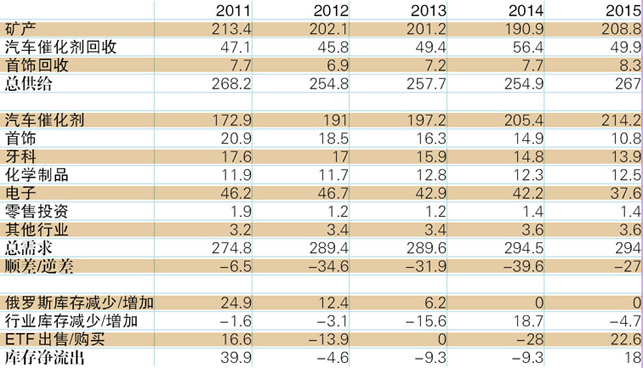 投资方面,2015年铂金、钯金ETF投资均由净流入转为净流出,其中钯金流出量较大,约合钯金需求量的7.7%,凸显低迷走势下,投资者对钯金兴趣缺乏。(表4)