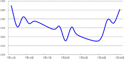 上周,因美联储和日本央行均维持当前基准利率水平不变,美元承压下跌,拉动国际金价上涨,周五收于1350.59美元/盎司,较前一周上涨2.16%。