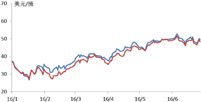 2016年初,国际金融局势不稳定,国际原油与其他大宗商品价格一同下跌,触及本轮下跌新低,1月20日、2月11日形成双底。2月末始,油价反弹并持续到6月初。上半年,布伦特原油收于49.72美元/桶,最高52.70美元/桶,最低27.79美元/桶,上涨32.23%;WTI原油收于48.40美元/桶,最高51.53美元/桶,最低26.76美元/桶,上涨30.56%。布伦特价格始终高于WTI,两者的价差在2月和4月一度拉宽,之后又收窄至2美元以下。(图1)