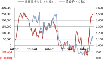 图5 近四年CFTC非商业净多头持仓及收盘价走势