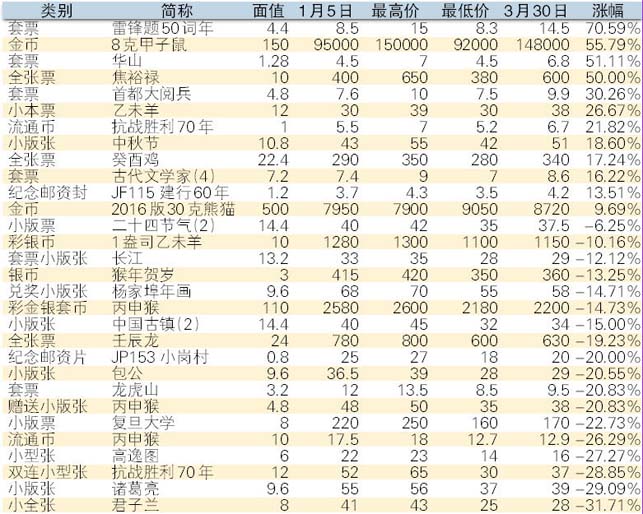 流通币的成交热门品种集中在2015年之后发行的新品上,尤其是6月份随着“丙申猴”贺岁流通币第二批货源的兑换,市价正像此前预测的那样出现了快速回落态势。8月初,“丙申猴”贺岁流通币单枚散币的市价已下挫到13元附近,与5月底相比跌幅为25.71%,而40枚一卷的卷币单枚价格则下沉至13.5元,与此前21元价格相比,下跌幅度高达35.71%,是跌幅最大的。