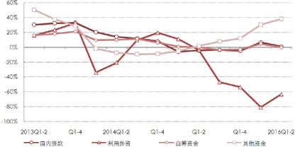图7 2013年-2016年房地产开发企业季度累计到位资金来源同比情况