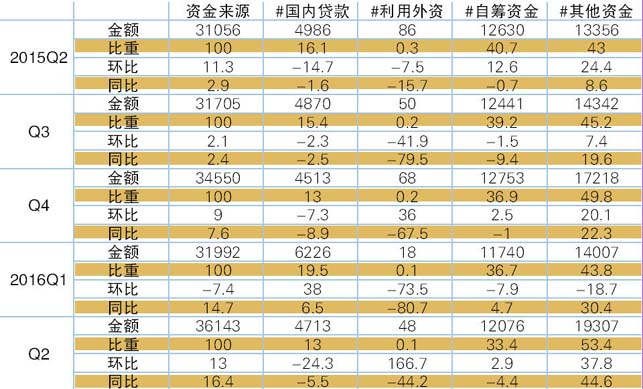 表1 2015-2016年各季度房地产开发企业资金来源情况 单位:亿元、%
