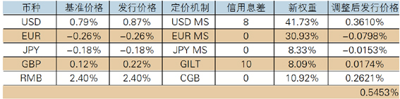 用SDR短期利率的计价逻辑来推算3年期SDR债券的利率,参考离岸债券市场中各币种货币债券的定价基准进行组合定价。世界银行作为经常性发行人在国际债券市场中已构建资金离岸债券市场中,美元债的定价基准为美国国债,英镑债的定价基准为英国国债,欧元债的定价基准为欧元的掉期中值,日元的定价基准为日元掉期卖出价,以及境内人民币国债的二级市场价格。通过权重组合可大致测算世行在离岸发行SDR债券的定价区间范围。(表1)