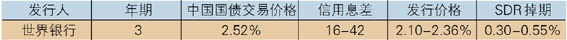 根据发行人的类型和评级,选择中国银行间市场中可比发行人的同期限债券的一级市场新发行价格,并结合二级市场交易情况,大致确定SDR债券折合人民币计价的定价区间,再通过模拟远期SDR汇率进行货币掉期即可测算SDR计价的发行利率区间。近期中国国债1年、2年、3年期债券交易价格的掉期后成本可作为世界银行在中国境内发行SDR债券的参考利率区间。(表2)