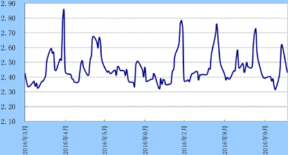 货币市场:上周,受节日因素扰动,银行间市场资金面趋紧,质押式回购主要品种收益率呈现不同程度的上行,其中,7天期品种收益率上行12个基点至2.43%。考虑到季末MPA(宏观审慎评估)及十一假期等因素影响,短期资金面或仍将面临考验。