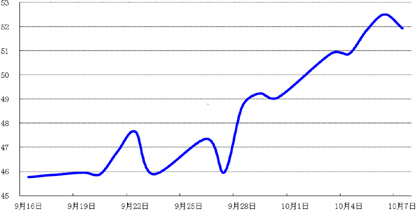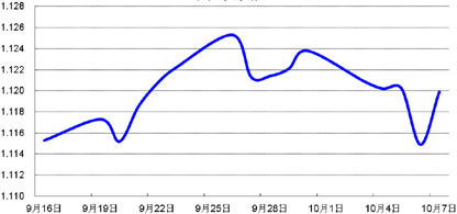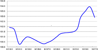 节前最后一周,人民币对美元整体持稳,维持在6.67附近窄幅整理。国庆长假期间,因美国公布的制造业PMI、工业产出、耐用品订单等重要数据均好于预期,美元指数从95.5附近上涨,连破96、97整数位,最高至97.3上方,10月7日收盘回落至96.5附近。