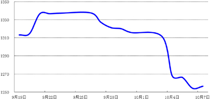 国庆长假期间,因美国经济数据好于预期,美元大幅走强,打压国际金价,10月3日开于1318.41美元/盎司,7日收于1257.29美元/盎司,周跌幅4.47%,其中,10月4日当日重挫3.22%。金价最低跌至1240附近,回吐了6月24日英国脱欧公投以来的涨幅。