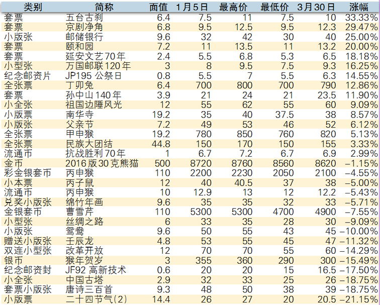 今年发行的“丙申猴”全张票、套票、小版张、赠送小版张和小本票则分别在680元、18元、122元、38元和54元附近盘旋,走势相对稳定。