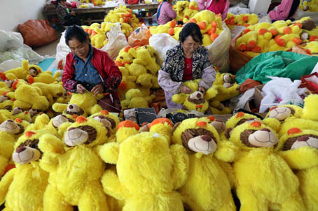 中国生产的圣诞玩具吸引了海外客商的大批订单,国内玩具加工企业加紧生产,满足市场需求。图为江苏省连云港市赣榆区厉庄镇淑华玩具员工在生产出口欧美市场的玩具。图/CFP