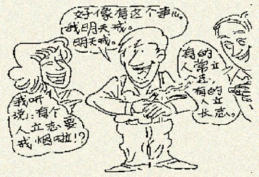 王二跑到单位,和同事也说了,让同事们监督他戒烟。不过,办公室里抽烟的人多,很快王二就禁不住诱惑。有同事说:你不是要戒烟吗?王二说:明天,明天一定戒。