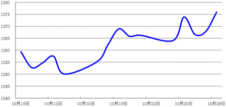 上周,尽管美元走强令金价承压,但时逢印度的财神节和排灯节,黄金作为传统礼物馈赠,实际需求增加,支撑金价。周五,国际金价收报1266.25美元/盎司,当周上涨0.76%。