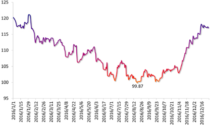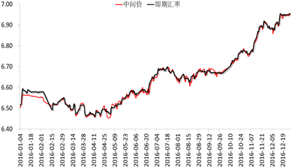 2016年美元指数全年升值约3.7%,在“参考一篮子货币”定价机制下,国际市场美元的强势会自动对人民币施加贬值压力,这是人民币对美元双边汇率持续贬值的主要外因。