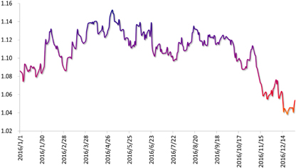 与美国日益背道而驰的货币政策和动荡不安的政治格局是2016年欧元走弱的主要原因,在可预见的2017年,欧元料将难以摆脱上述两大负面因素的困扰,欧洲经济数据的起落几乎被市场忽略,庞大的国际收支经常项目顺差也未能对欧元汇率起到明显的支撑作用。