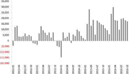 再次,货物贸易项下银行代客结售汇顺差再现。货物贸易顺差一直是我国结售汇顺差和外汇储备的主要来源,但2015年受浓郁的人民币贬值预期影响,高额的货物贸易顺差并未转化为结售汇顺差。2015年,我国货物贸易顺差近6000亿美元,但货物贸易项下银行代客结售汇却是逆差379亿美元。这主要是由于企业在人民币单边升值时积累了大量外债,单边升值预期被打破后,为规避汇率风险,企业的合理选择是将美元收入优先偿还外币负债,同时部分企业在贬值预期下选择推迟结汇时间。但在维持企业运营的压力下,企业的结售汇操作与其收支状况在长期必然是一致的。换句话说,货物贸易项下的高额顺差最终将反映在结售汇上。2016年的情况已经发生变化,前11个月,我国货物贸易顺差4774亿美元,对应的货物贸易项下银行结售汇顺差1668亿美元,与2015年相比出现明显改观。货物贸易项下结售汇顺差的再现与增长,无论对人民币汇率还是对外汇储备都将起到重要的支撑作用。