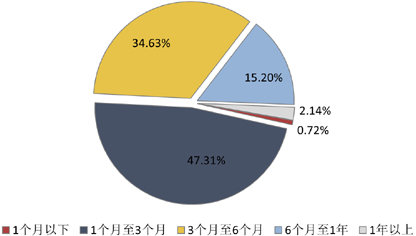 从投资期限来看,1个月以下产品发行了635款,环比减少756款,市场占比下降1.09个百分点至0.72%;1-3个月产品发行了41885款,环比增加2931款,市场占比下降3.37个百分点至47.31%;3-6个月产品发行了30657款,环比增加6456款,市场占比上升3.14个百分点至34.63%;6-12个月产品发行了13459款,环比增加2760款,市场占比上升1.28个百分点至15.20%;1年以上产品发行了1892款,环比增加275款,市场占比上升0.03个百分点至2.14%。(图2)