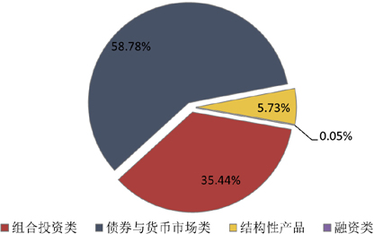 从投向类型来看,债券与货币市场类产品发行了52037款,环比增加7926款,市场占比上升1.39个百分点至58.78%;组合投资类产品发行了31374款,环比增加2028款,市场占比下降2.74个百分点至35.44%;结构性产品发行了5073款,环比增加1737款,市场占比上升1.39个百分点至5.73%;融资类产品发行了44款,环比减少25款,市场占比下降0.04个百分点至0.05%。(图3)