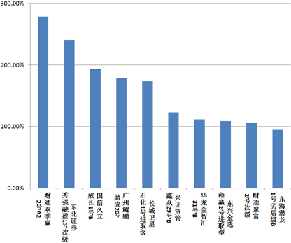 从表现最好的产品收益情况来看,排名前十产品中次级产品仍是主流,包括股票型5款、混合型3款、债券型2款。(图10)