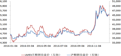 2016年伦铜市场开于4716美元/吨,年末收于5516美元/吨,涨18%。沪铜走势大体与之一致,开于36480元/吨,收于45500元/吨,涨24%。(图1)