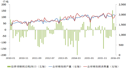 2016年铜市场基本面略有好转,市场处于小幅供给不足。根据国际铜业研究组织(ICSG)的数据,前9个月供给缺口29万吨,2015年同期为供给过剩34万吨。(图2)